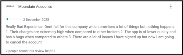 A user gave a 1-star rating in December 2025 and summarised their experience in three points: the broker promises a great deal but delivers very little, charges are extremely high compared to competitor brokers, and the app has consistent bugs that are inferior to competing platforms.