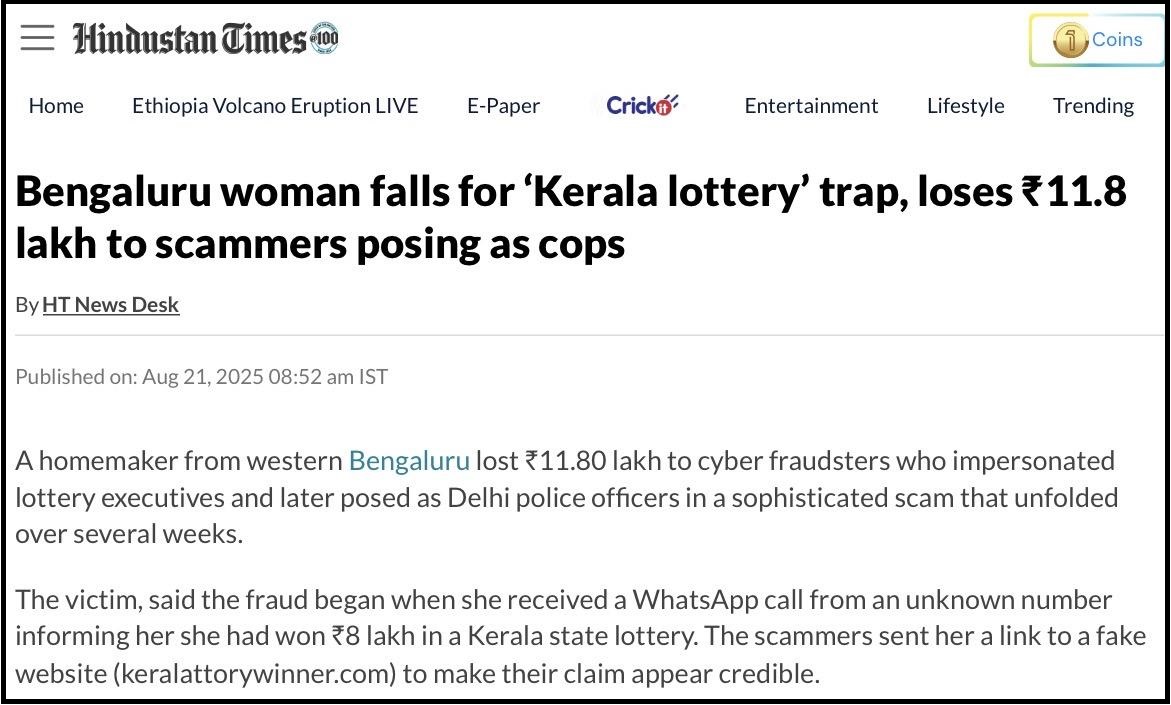 A homemaker from Bengaluru got a call on WhatsApp telling her she had won ₹8 lakh in a Kerala state lottery. The callers posed as lottery officials and later as Delhi police. They convinced her to pay processing fees through a fake website designed to look official. She ended up losing ₹11.8 lakh before realising it was a scam.