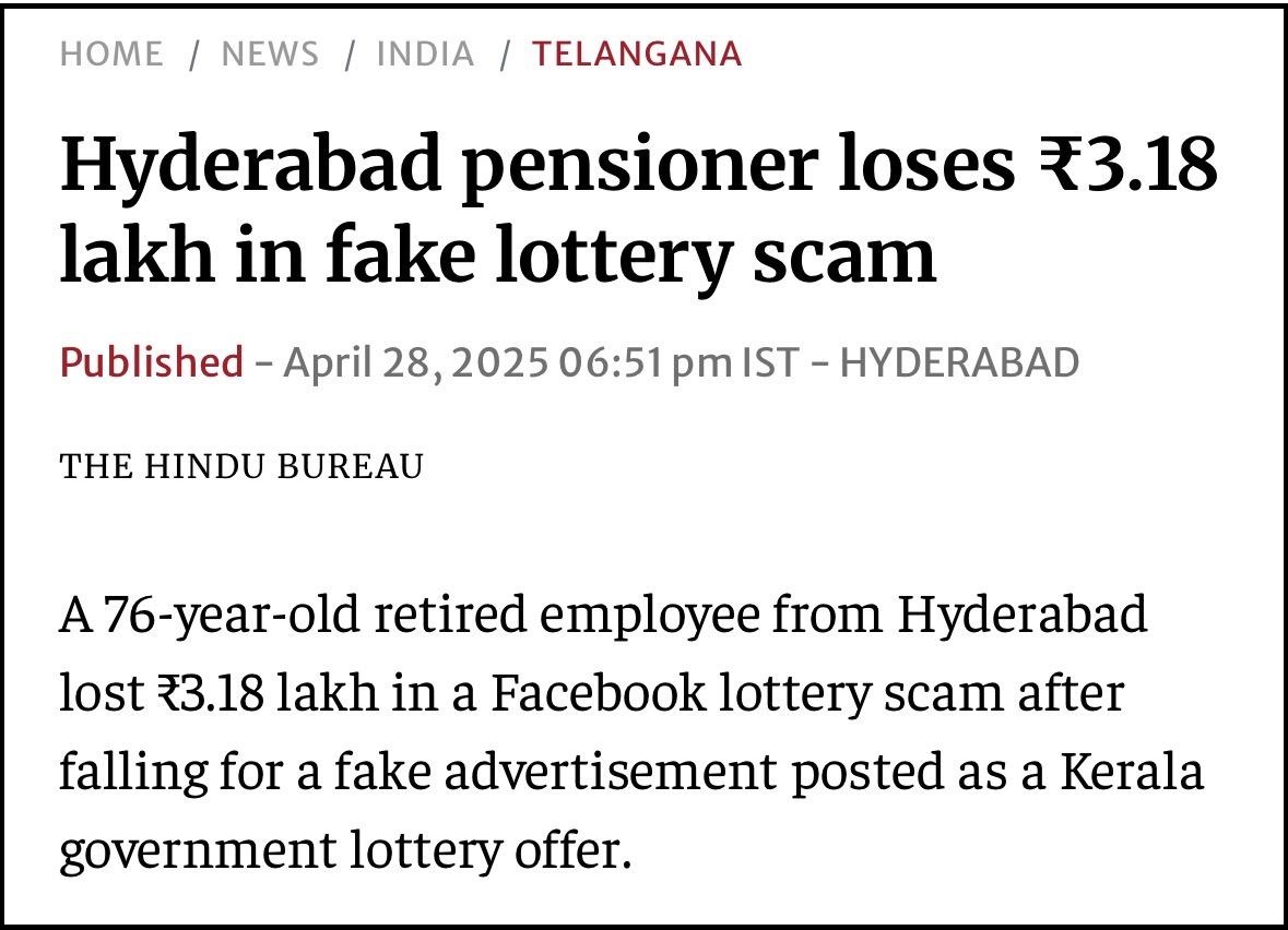 Hyderabad Pensioner Loses ₹3.18 Lakh in Fake Kerala Lottery Scam