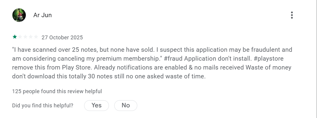 कुछ यूज़र्स बताते हैं कि उन्होंने 25 से ज़्यादा नोट स्कैन किए, फिर भी कोई सेल नहीं हुई,मतलब मेहनत का कोई फायदा नहीं।