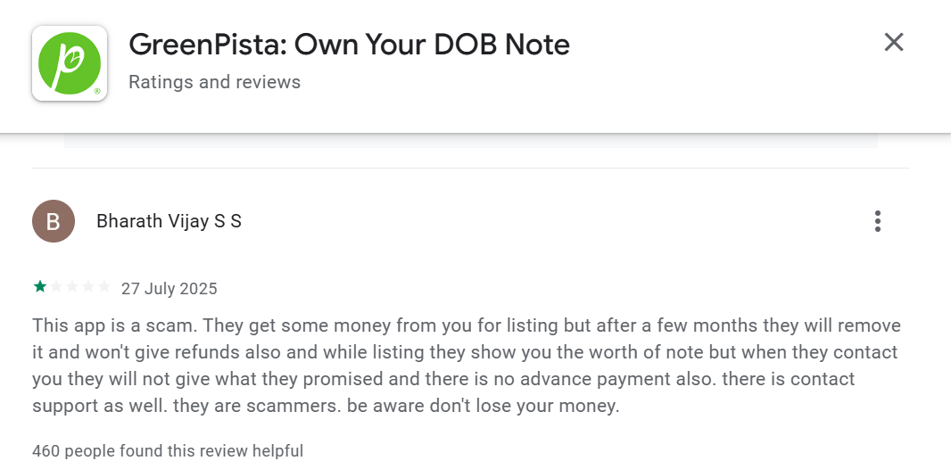 आप स्क्रीनशॉट में देख सकते हैं कि कई यूज़र्स ने Green Pista App को लेकर गंभीर शिकायतें की हैं।