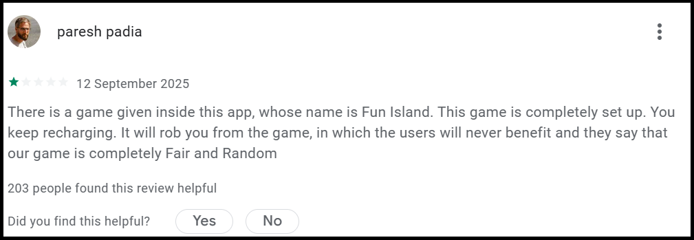 कई यूज़र्स कहते हैं कि in-app गेम Fun Island “rigged,” “set up,” या “पैसा निकालने के लिए डिज़ाइन किया गया” है।