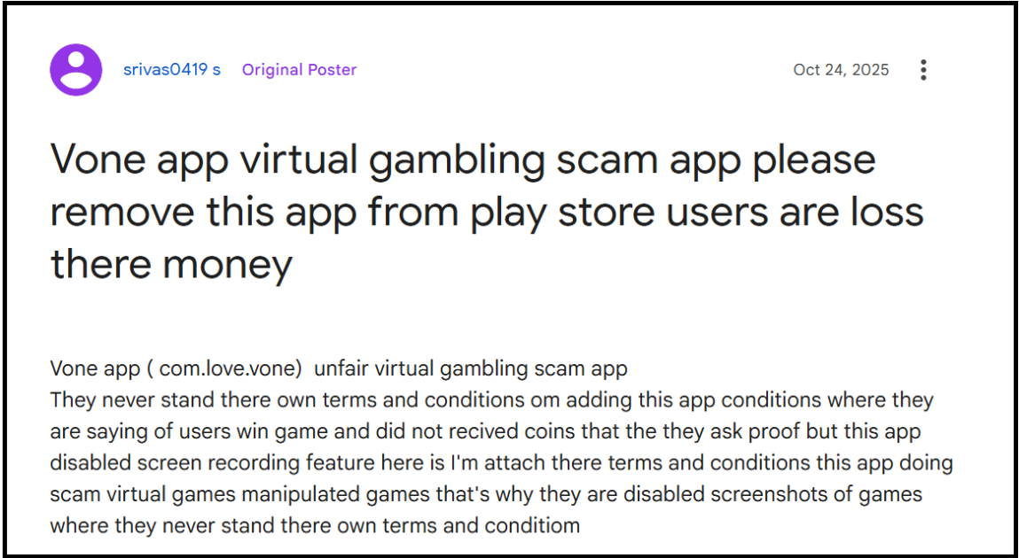 इसका मतलब है कि अगर कोई शिकायत होती है, तो कंपनी कह सकती है, “यह हमारा ऐप नहीं है” या “आप किसी और Vone की बात कर रहे हैं।”