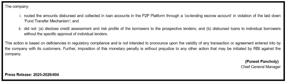 However, according to the RBI’s penalty documentation, funds were routed through unauthorized co-lending escrow accounts instead of proper P2P channels.