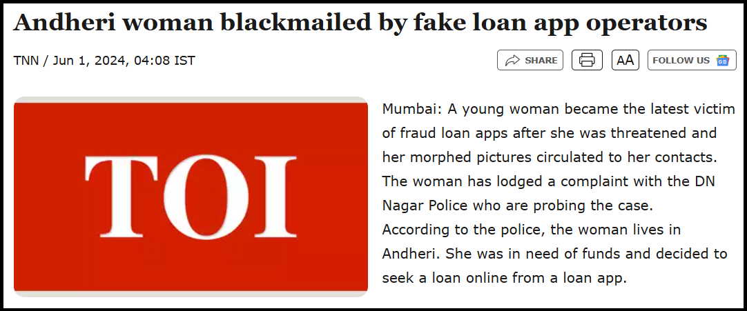 ये स्क्रीनशॉट Times of India के ओफ्फ्सिअल वेबसाइट से लिए गया है जहा हम देखते हे की मुंबई की एक युवती ने पैसे की ज़रूरत में एक ऑनलाइन लोन ऐप से लोन लेने का फैसला किया।