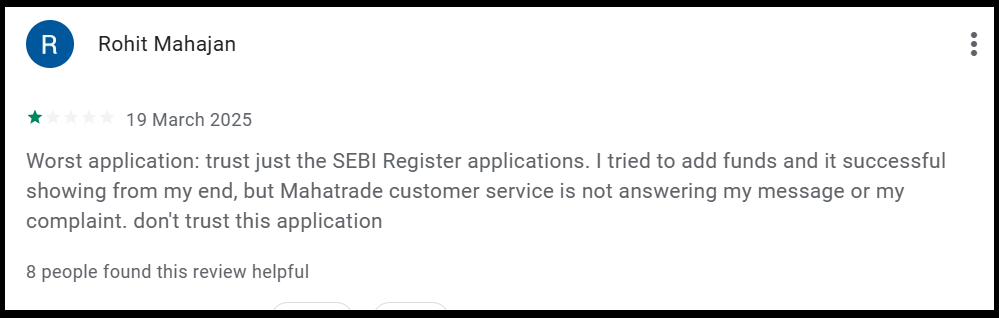 When confronted about their lack of SEBI registration, Mahatrade’s official response states: “Mahatrade is currently in the process of obtaining all required registration. We assure you that user funds and data security are our top priorities. Our existing customers are fully satisfied with our transparent and consistent services. Once the registration process is complete, we will notify it officially.”