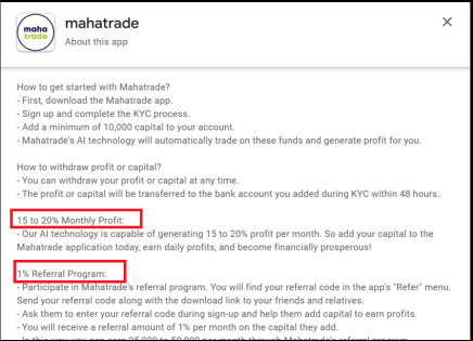 Mahatrade operates a 1% monthly referral commission program on deposits made by referred users.