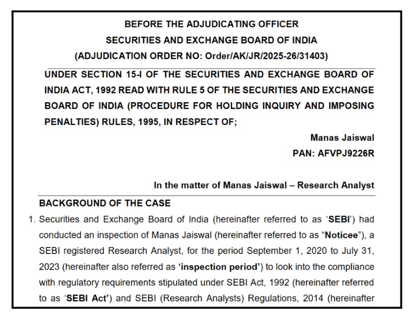 SEBI conducted an inspection of Manas Jaiswal’s operations covering the period from September 1, 2020, to July 31, 2023.