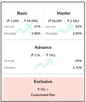 - Basic Plan requiring a minimum ₹1,000 and up to ₹50,000 for 37% annual returns