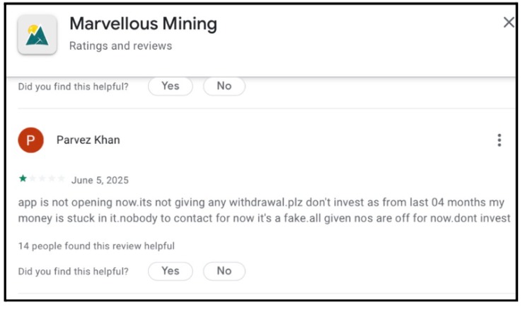 Many Google reviews for the Marvellous Mining app appear manipulated, with overly positive ones suspected as paid promotions.