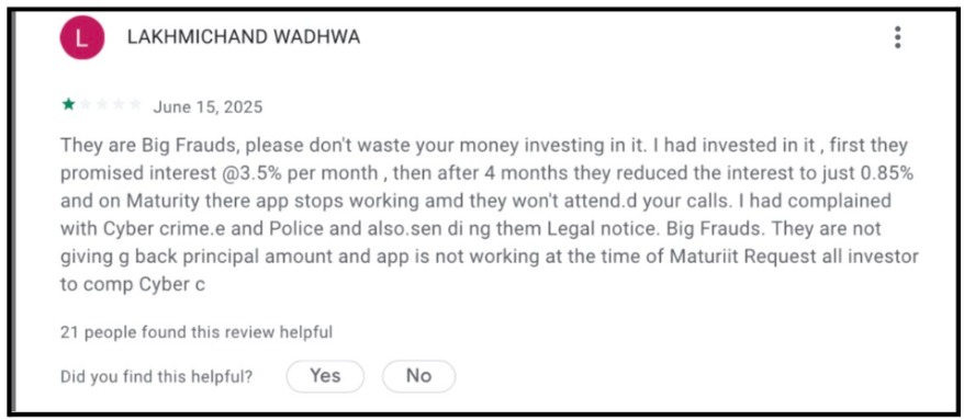 If we look at another user, they also claim it as a fraud. They say initially it promised huge returns, but after that, it reduced the interest rate, and now they are not even returning the principal amount.