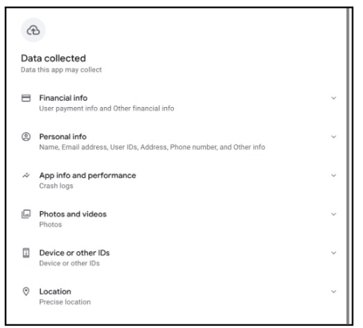 The app collects location, personal info, financial information, and more that are not required for its functioning.