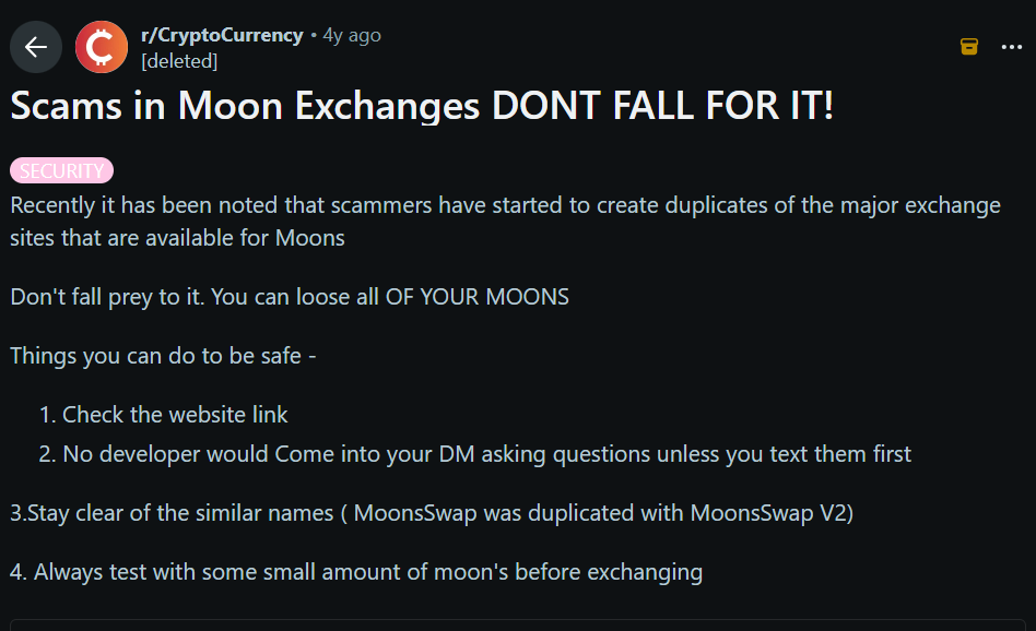 On Reddit, a well-known crypto community shared warnings about “Moon” and “Moon exchange” scams.