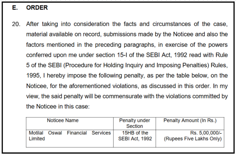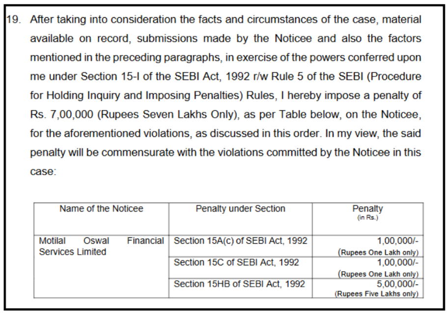 After examining all the facts, evidence on record, and submissions made by Motilal Oswal Financial Services Limited (MOFSL), SEBI reached a conclusive finding of regulatory violations and exercised its statutory powers to impose a monetary penalty.