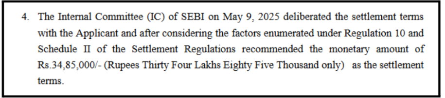 Consequently, SEBI accepted MOFSL’s settlement application and imposed a settlement amount of ₹34,85,000 (Rupees Thirty-Four Lakh Eighty-Five Thousand only).