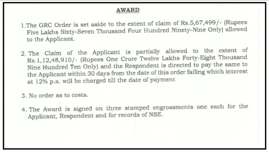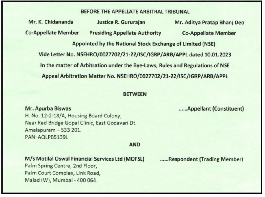 The dispute was brought before an Arbitral Tribunal under the rules of the National Stock Exchange of India (NSE).