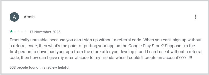 This complaint says that the user cannot use the app after downloading it, as he does not have a referral code. Then, is the app meant for a certain group of people? At least this promotional strategy says so. But why?