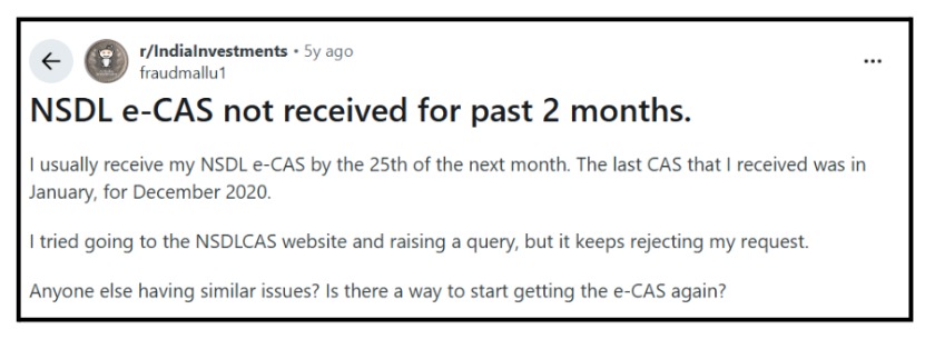 Users report being unable to download or receive NSDL e-CAS for months, with the NSDL CAS website repeatedly rejecting requests despite multiple attempts.