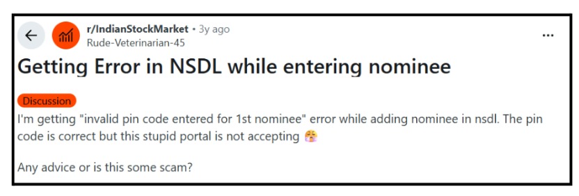 Users report repeated errors while adding nominee details on the NSDL portal, such as “invalid pin code” messages, even when correct information is entered.