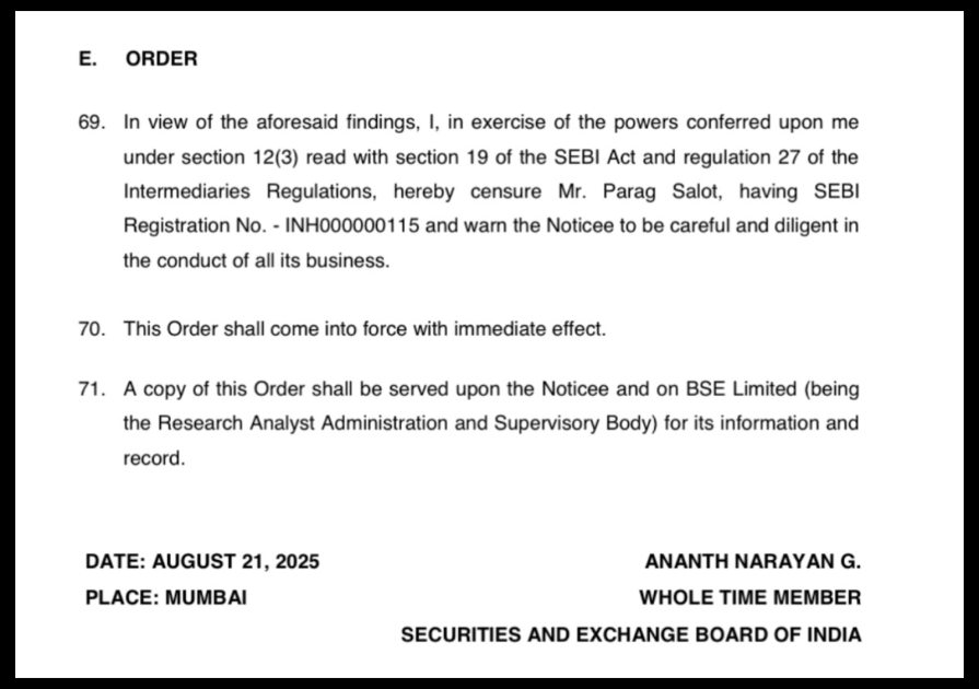 After the same inspection cycle, SEBI ran intermediary enforcement proceedings and examined whether Parag Salot mis-sold services, assured profits, and breached multiple Research Analyst compliance requirements.