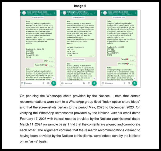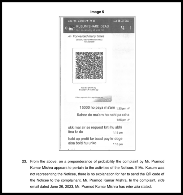 SEBI held that the complaint evidence was credible on “preponderance of probability,” noting linkages like the QR code directing to the notice’s account and matching client/payment timing.