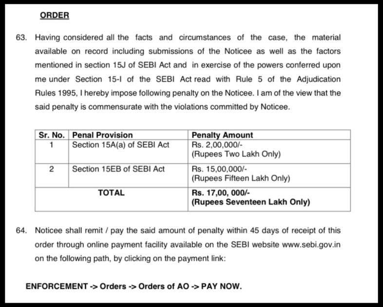 SEBI imposed a total monetary penalty of Rs. 17,00,000 (Rs. 2 lakh + Rs. 15 lakh under different penalty sections) and directed payment within 45 days (else recovery).