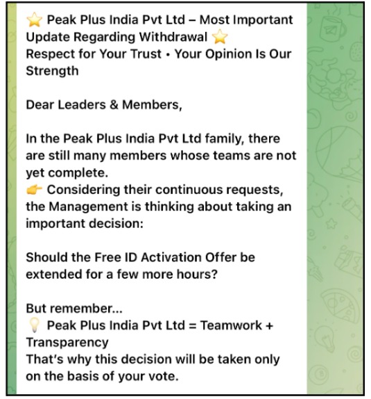 Users whisper about panic in groups, with viral claims of “Peakplus big scam” and pending withdrawals.
