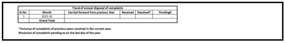 A second complaint disclosure document, dated for more recent reporting, shows a monthly trend starting from July 2025 and an annual trend for 2025–26.