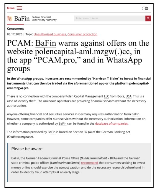 The German BaFin authority has also warned consumers specifically about the polencapital-aml.mzgw(.cc) website and the PCAM.pro app, confirming that these entities have no authorization to provide financial services.