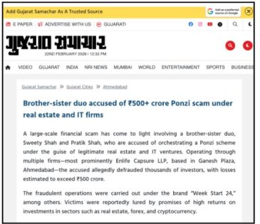 In Ahmedabad, brother-sister duo Pratik and Sweety Shah disguised their Ponzi operation as legit real estate and IT firms like Enlife Capsure LLP.