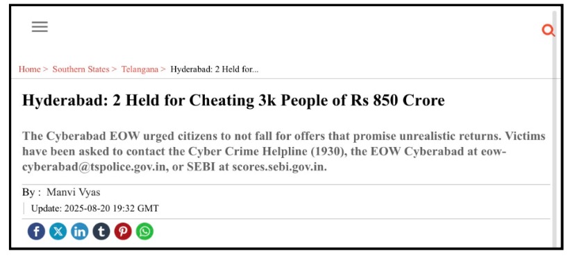 The Economic Offences Wing of Cyberabad Police registered a case after investors lost over Rs 5 crore across states.