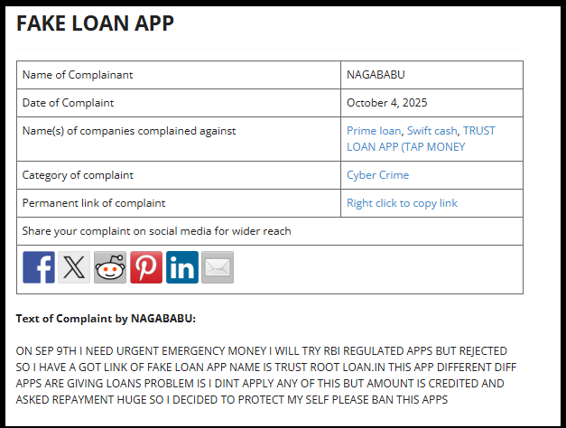 The complainant stated that on September 9, he required urgent emergency funds and initially attempted to apply through RBI-regulated loan applications, but his applications were rejected.