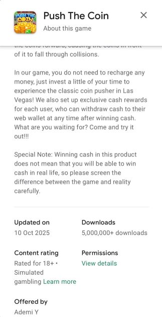 “Push The Coin doesn’t pay real money. The money that you earn in the app is actually virtual.”