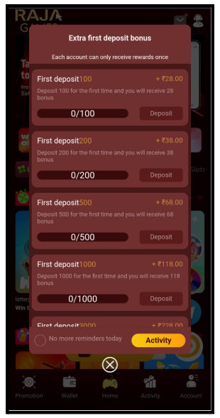 According to the app, Raja Games offers deposit bonuses. For example, a first deposit of ₹100 gives a ₹28 bonus, a ₹200 deposit gives a ₹38 bonus, and the highest tier shows a ₹3,000 deposit earning a ₹228 bonus.