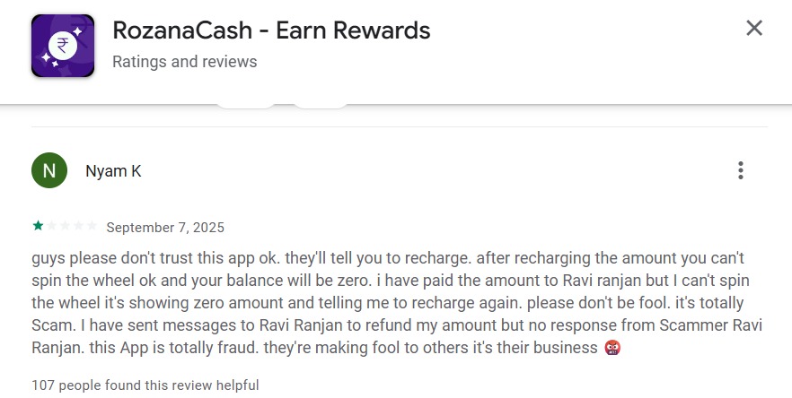 कई users का कहना है कि Rozana Cash App recharge करवाने के बाद ना wheel चलने देता है, ना balance दिखाता है, और ना ही पैसे लौटाता है।
