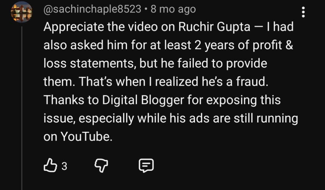 Sachin Chaple’s complaint highlights a critical red flag: Ruchir Gupta refuses to provide profit and loss statements.