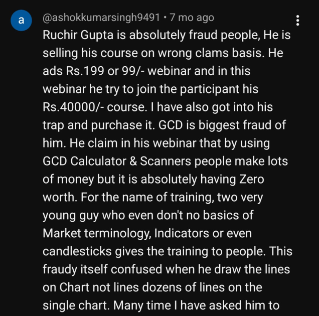 The complaints against Ruchir Gupta reveal a consistent pattern: expensive courses with minimal value, Excel sheets with historical data presented as proprietary methods, poor customer support, and devastating financial losses for those who follow his recommendations.