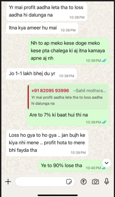 Shortly, Sahil started ignoring him, and when the victim sent various messages, he still replied with “let the profit happen”, “you will receive 100% profit.”