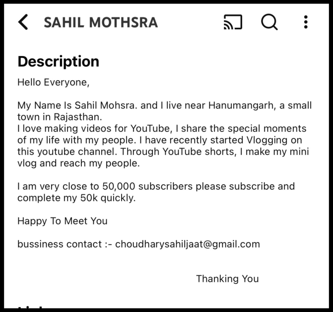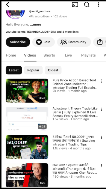 - A telegram channel called Sahil Mothsra Trading Hub with 3.9k subscribers. This is where he shares links to his live videos and trading and investment tips.