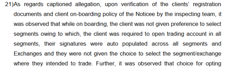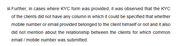 Common mobile/email IDs linked to multiple client accountsMissing KYC forms Auto-population of client choices Signatures auto-populated across all segmentsNon-cooperation with SEBI inspection |