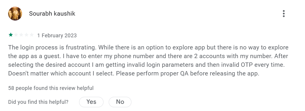 Multiple accounts linked to single phone numbers. Invalid OTP errors. Login parameters fail repeatedly. Basic app functionality doesn’t work.