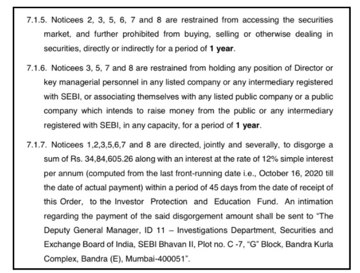 SEBI restrained Kishan Nanda (the main accused) from the securities market for 3 years and barred him from key roles in listed firms or SEBI intermediaries.