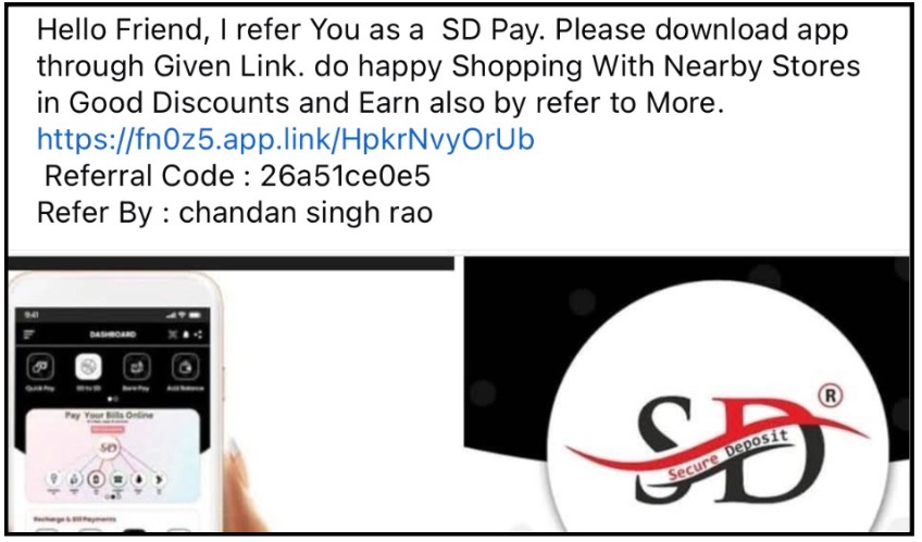 SD Pay presents itself as a digital wallet app, much like PhonePe or Paytm, where users can supposedly recharge mobiles, pay bills, and shop online. Users can also earn through a multi-level referral system promising up to 15 levels of income.