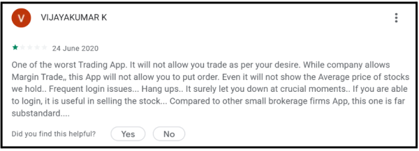 A user, Vijayakumar K, criticizes the app for restricting order placement and not supporting margin trading properly.