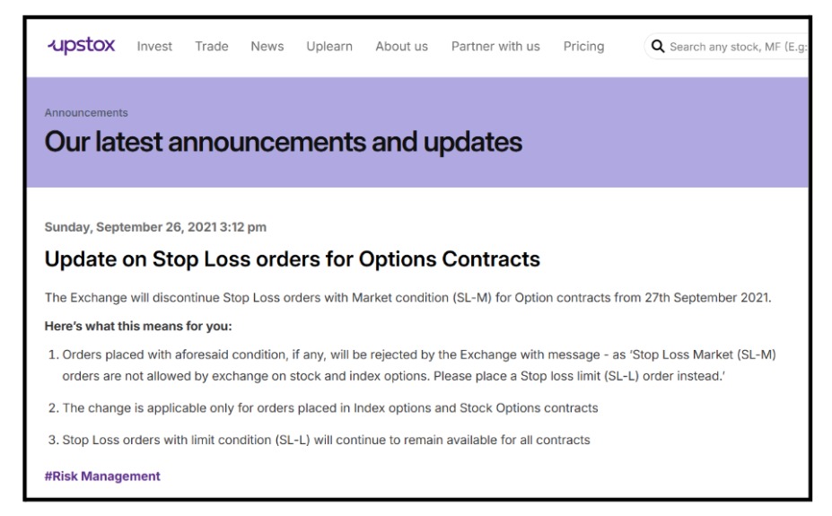 According to the Upstox announcement (September 2021), exchanges stopped allowing Stop Loss Market (SL-M) orders for options. This started on September 27, 2021.