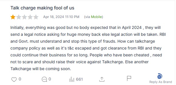 Another user reported that everything seemed fine initially, but in April 2024, TalkCharge sent a legal notice demanding a huge repayment under threat of legal action.