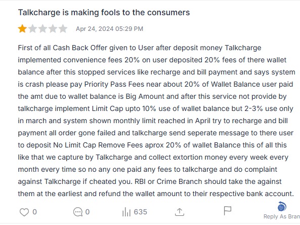 One more user reported that: Talkcharge users were charged excessive fees, up to 20% of their wallet balance, for services like recharges and bill payments, even after limits were supposedly capped.