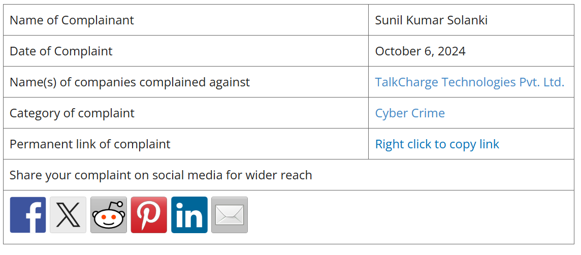 There is not one but multiple complaints of TalkCharge that prove that it is not a safe platform.
