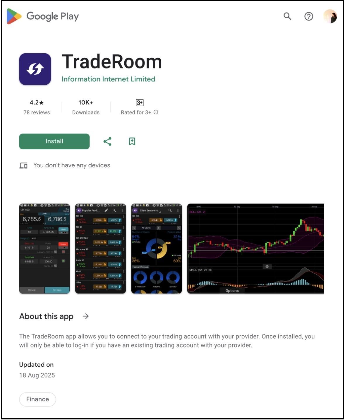 This TradeRoom app is tied to actual forex or CFD trading, where users connect real trading accounts.