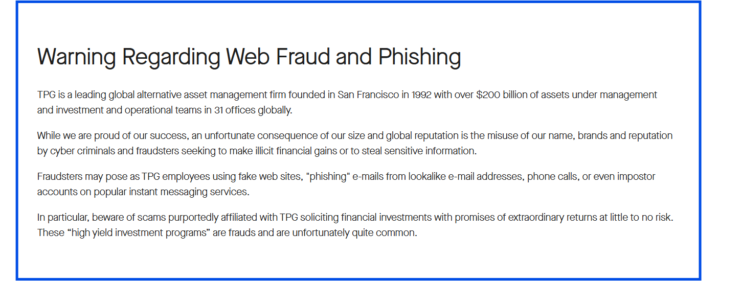 In fact, TPG itself has publicly warned investors about fraudsters misusing its name and brand to appear credible. These impostors often set up fake apps, websites, or social media profiles that look convincing at first glance.
